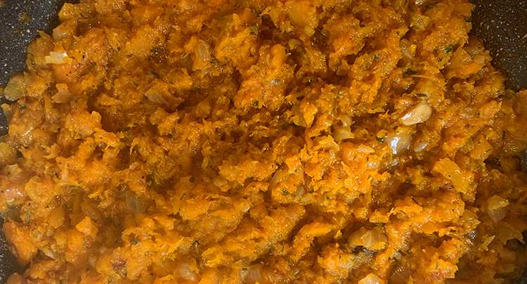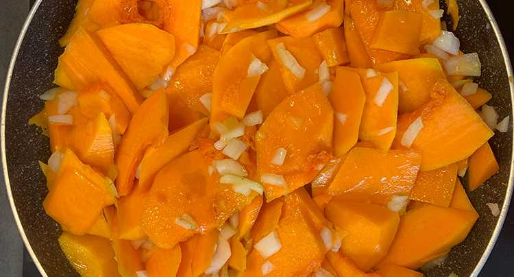 - Cortamos la calabaza y la cebolla (TIEMPO 10′, podemos reducir el tiempo sí tenemos la calabaza envasa al vacío) y lo sofreímos con aceite y especias. Recomendación 20-30 minutos a fuego lento en una sartén antiadherente y vamos machacándola hasta que quede como un triturado.