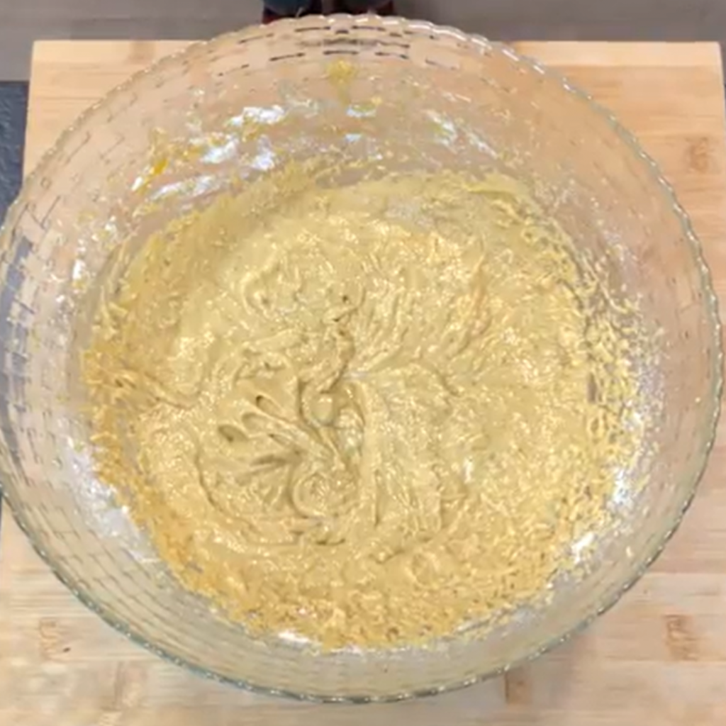 5. En otro bol echamos huevos, harina (tamizamos bien), nuestra mezcla anterior y la levadura. Batimos hasta que quede una mezcla homogénea